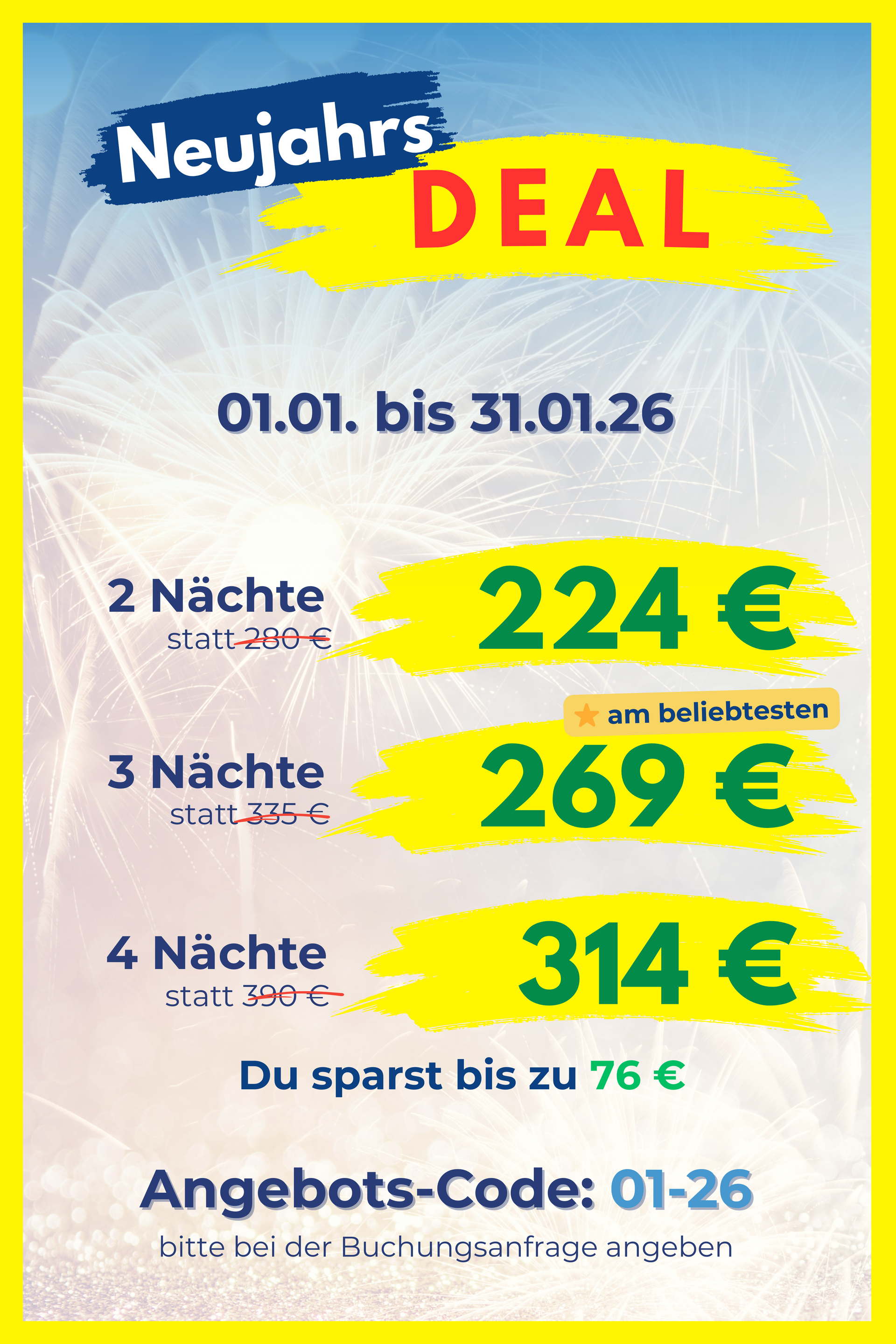 Bei Stornierung bis 30 Tage vor Anreise erhaltet ihr eine Rückerstattung von 100 % des bereits gezahlten Betrags.