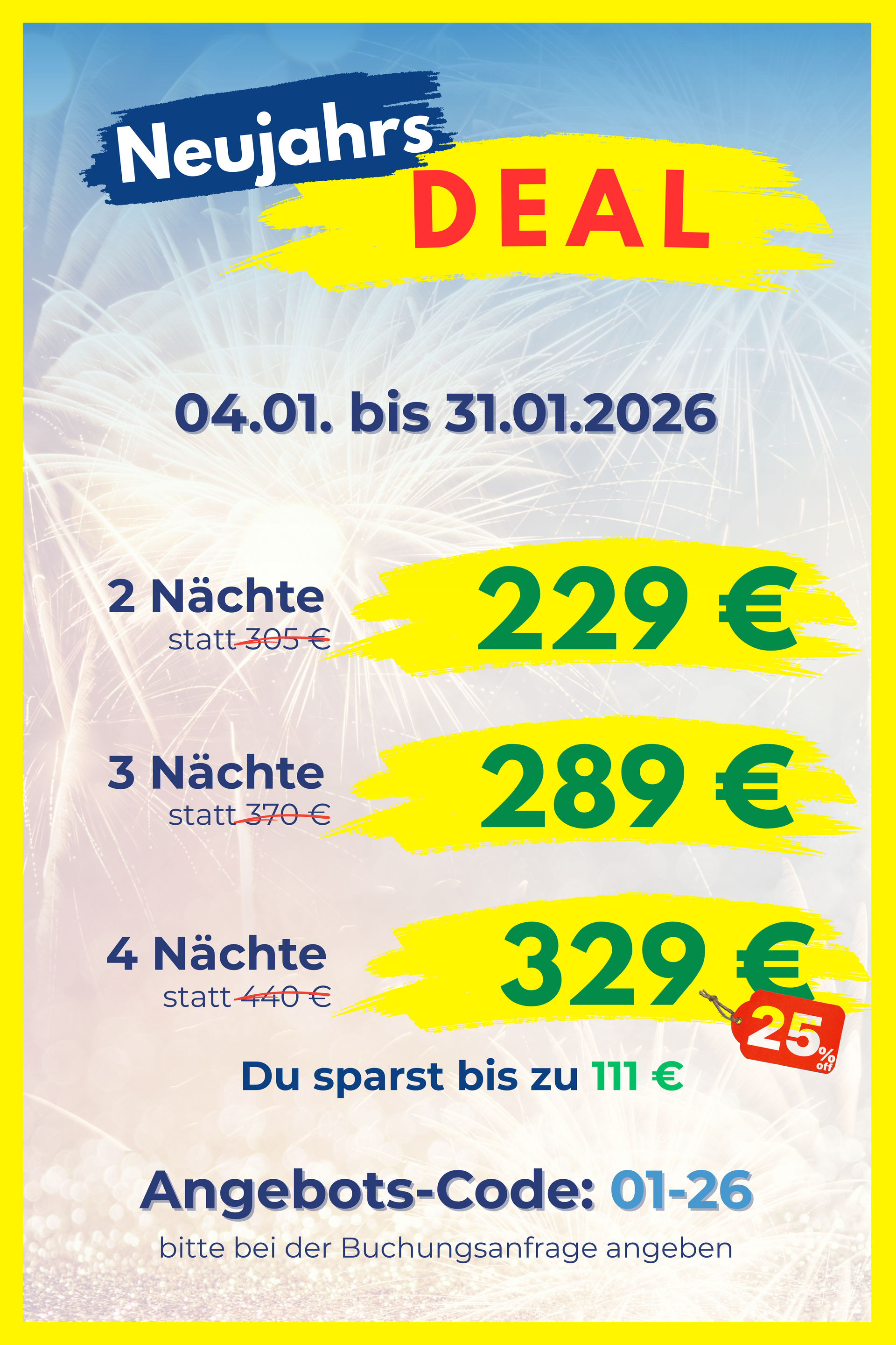 Bei Stornierung bis 30 Tage vor Anreise erhaltet ihr eine Rückerstattung von 100 % des bereits gezahlten Betrags.